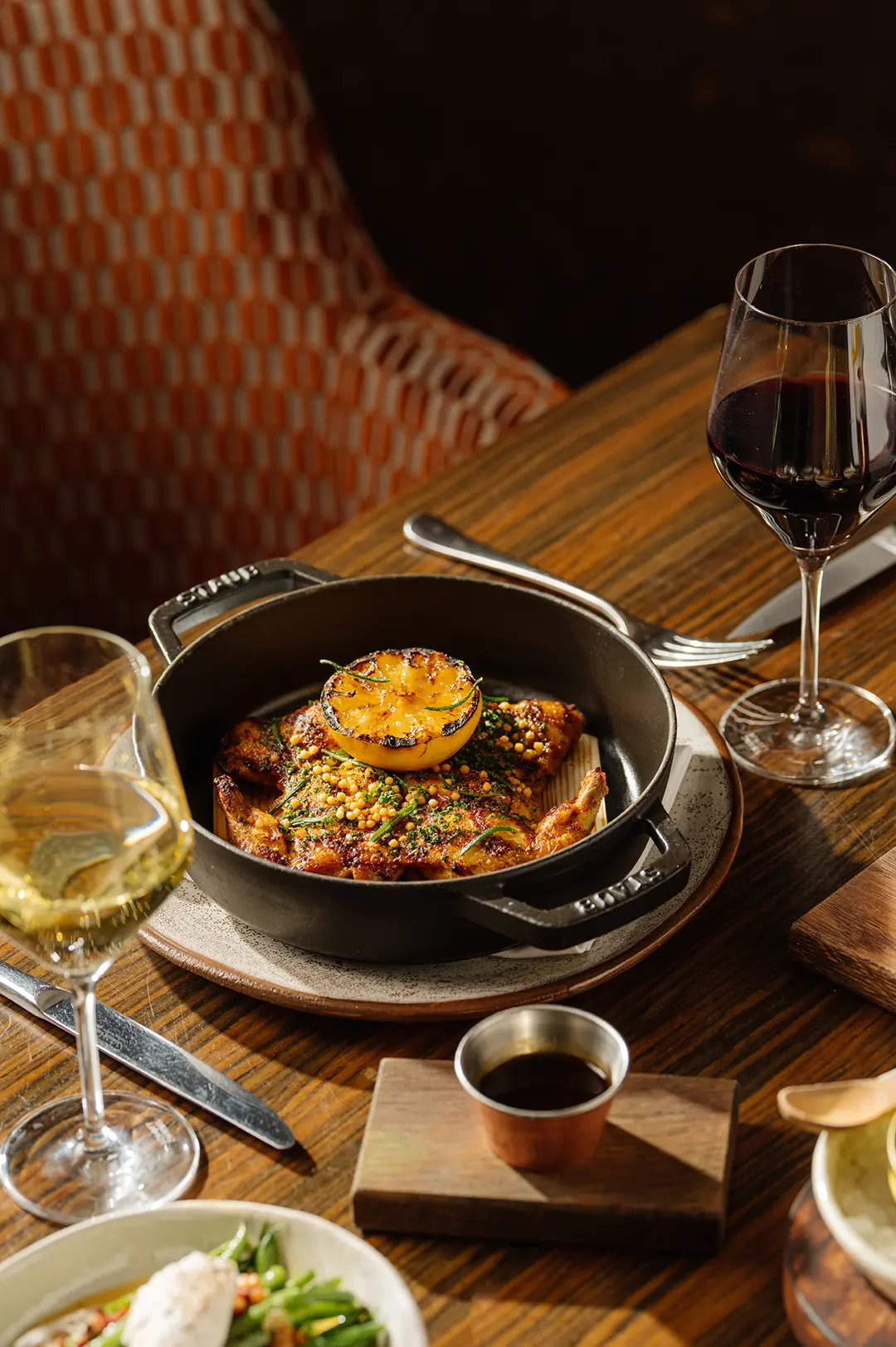 The menu features dishes like Seared beef carpaccio with mustard dressing, parmesan & watercress, Charred salmon with caviar, sour cream & horseradish, Crispy chicken with honey, lime & chilli glaze, Grilled dry-aged sirloin, and more.