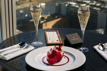 Aqua Shard is partnering with jewellery designer Dinny Hall this Valentine’s Day to present the ruby‑inspired Heart Jewel dessert. This elegant creation features a refined chocolate heart layered with white chocolate and yoghurt, smooth vanilla cheesecake, and delicately pickled English rose petals—beautifully crafted in homage to the iconic Dinny Hall collections.