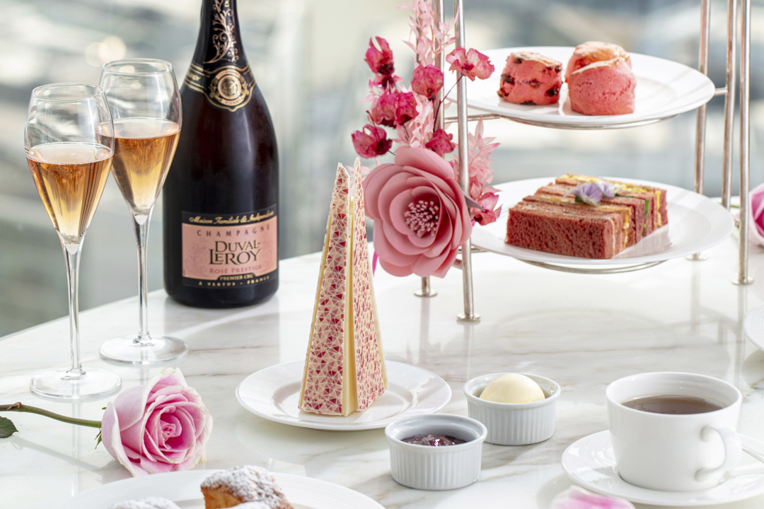 Guests can delight in a selection of finger sandwiches made with freshly-baked pink bread filled with coronation chicken, smoked salmon and cucumber, classic Reuben as well as truffle egg and cress. Rose pink sweet and savoury scones accompanied by strawberry jam and clotted cream lead into a refreshing selection of pastel treats including a blush sphere filled with shiso mousse, grapefruit and black pepper, a layered cake with pistachio and sour cherries and ’Shang Mont Rose’ with blackcurrant and mousse.