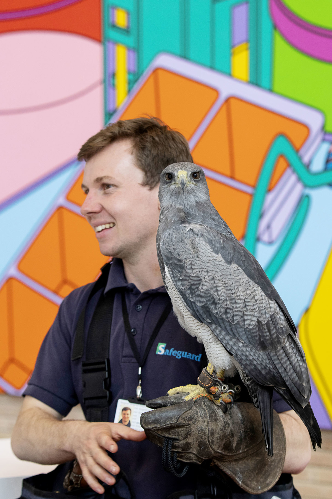 Working birds of prey are trained to return to their handlers through positive reinforcement (meat!) from an early age. Guido started training at one-and-a-half months and was fully grown – with a wingspan of five feet – by three months.